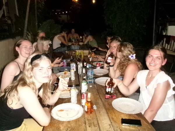 Efter lidt for mange timer i bølgerne med dejligt vejr og stærk sol, tog en solbrændt gruppe hen for at spise pizza-buffet på hostelet.